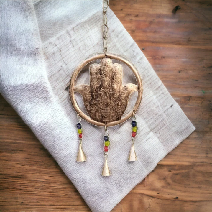 Agrega un toque de protección y estilo a tu espacio con nuestro encantador Colgante "Mano de Fátima con Ojo Turco" y Campanas. Este colgante combina el simbolismo de la Mano de Fátima, un amuleto de protección en muchas culturas, con la tradicional energía protectora del Ojo Turco y el sonido melódico de las campanas.