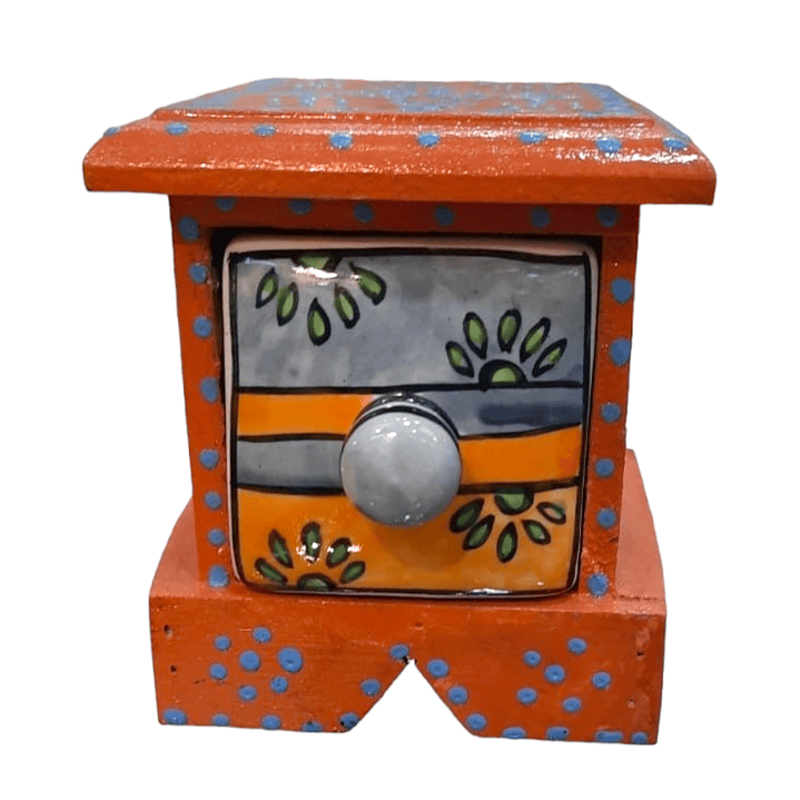Este joyero multiuso Crafts Antique, es una pieza única y tradicional, hecha a mano en India, que combina madera pintada a mano y un cajón lateral de cerámica. Su diseño elegante y decorativo lo convierte en un complemento perfecto para la decoración de tu hogar o mesa.